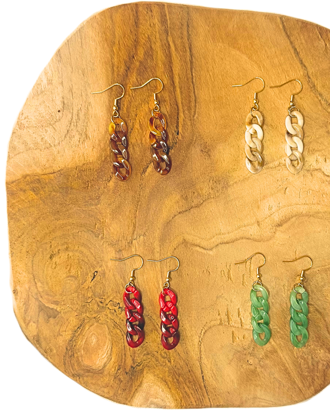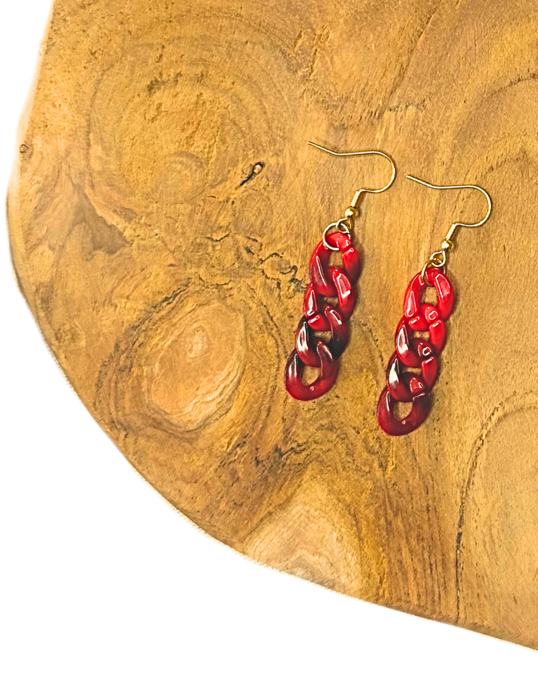 Le crochet d'oreille est en acier inoxydable doré et les maillons sont en acrylique.