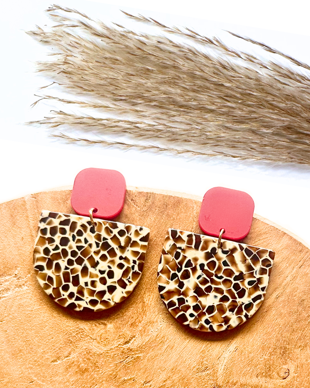 La puce d’oreille est en acier inoxydable doré. Les éléments géométriques sont en acrylique.